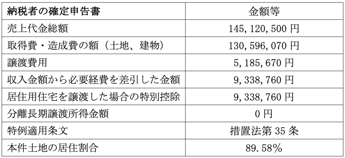 Xは、本件不動産について、措置法第35条の居住用家屋の敷地にあたる部分の割合(以下、「居住割合」という。)を89.58%と判断し、平成15年3月、以下の内容で確定申告書を提出した。